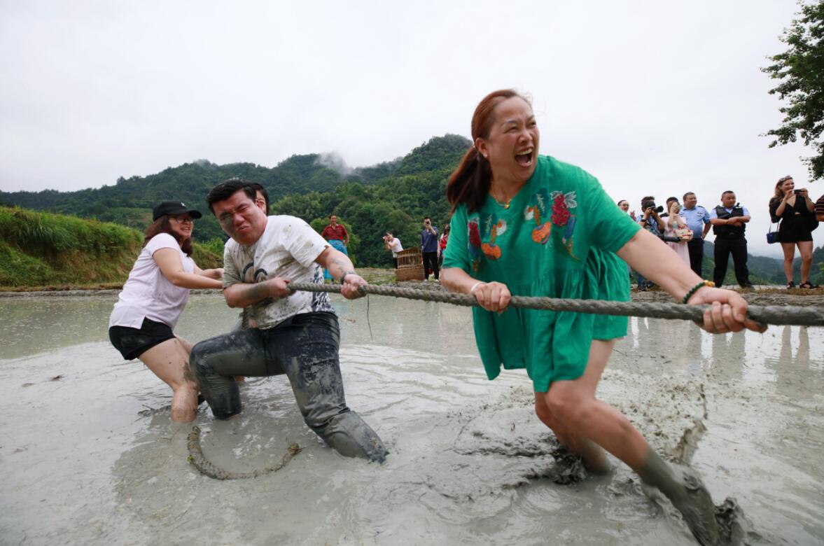 6月29日,在湖南張家界市武陵源區中湖鄉五號山谷度假民宿舉辦的第四屆鄉村民宿旅遊和農耕文化節中,遊客和當地村民一道在稻田的泥水間拔河、搶鴨、賽跑、摸魚、插秧,體驗鄉村民宿旅遊樂趣,感受田園生活。(張思靜 吳勇兵)
