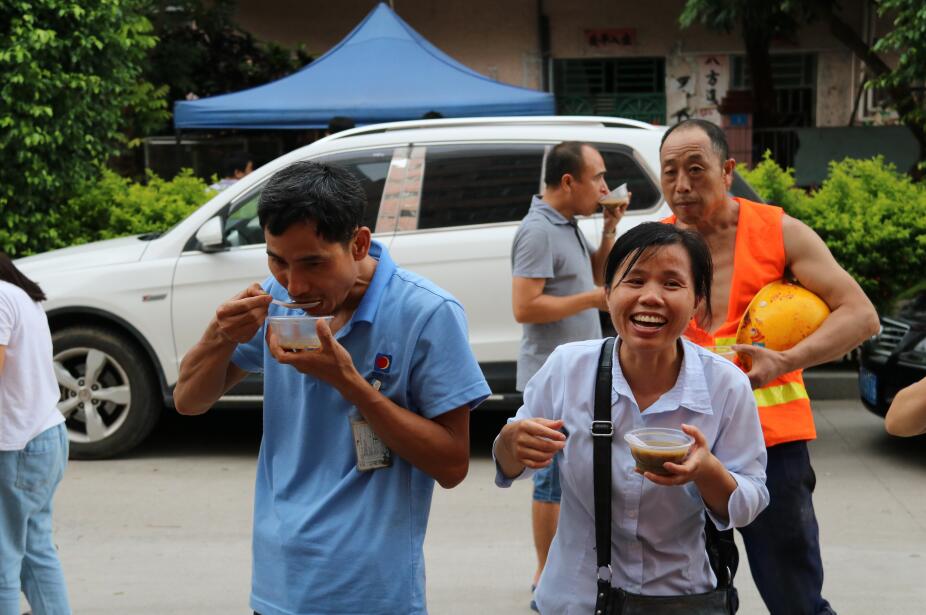儘管天氣炎熱,但一點也沒妨礙職工群眾的參與熱情。活動現場擠滿了前來參加活動的職工群眾,工作人員和義工將一碗碗親自熬制的綠豆糖水和菊花茶分發到大家手中,表達政府和工會組織對他們的關心和關愛,感謝他們為坪山的建設付出的辛勤勞動,對他們在高溫下仍堅持辛勤工作表示衷心感謝,同時叮囑他們要注意防暑降溫,保護好身體,努力做到工作身體兩不誤。爽口的綠豆糖水、甘甜的菊花茶、關切的問候,引來現場陣陣歡聲笑語。建築工李某表示,綠豆糖水吃在嘴裏,甜在心裏,社區黨委和工會真是貼心,那麼熱的天還惦記着他們一線員工。