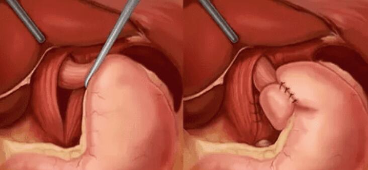 手術時,需要將突入胸腔的胃下降到腹腔,修補食管裂孔,恢復正常解剖位置,並進一步在食管下段加做一個 「閥門」(胃底摺疊),以抗胃酸反流。通過這種微創手術,能夠治癒那些有食管裂孔疝,長期藥物治療和影響生活質量的反流性食管炎患者。