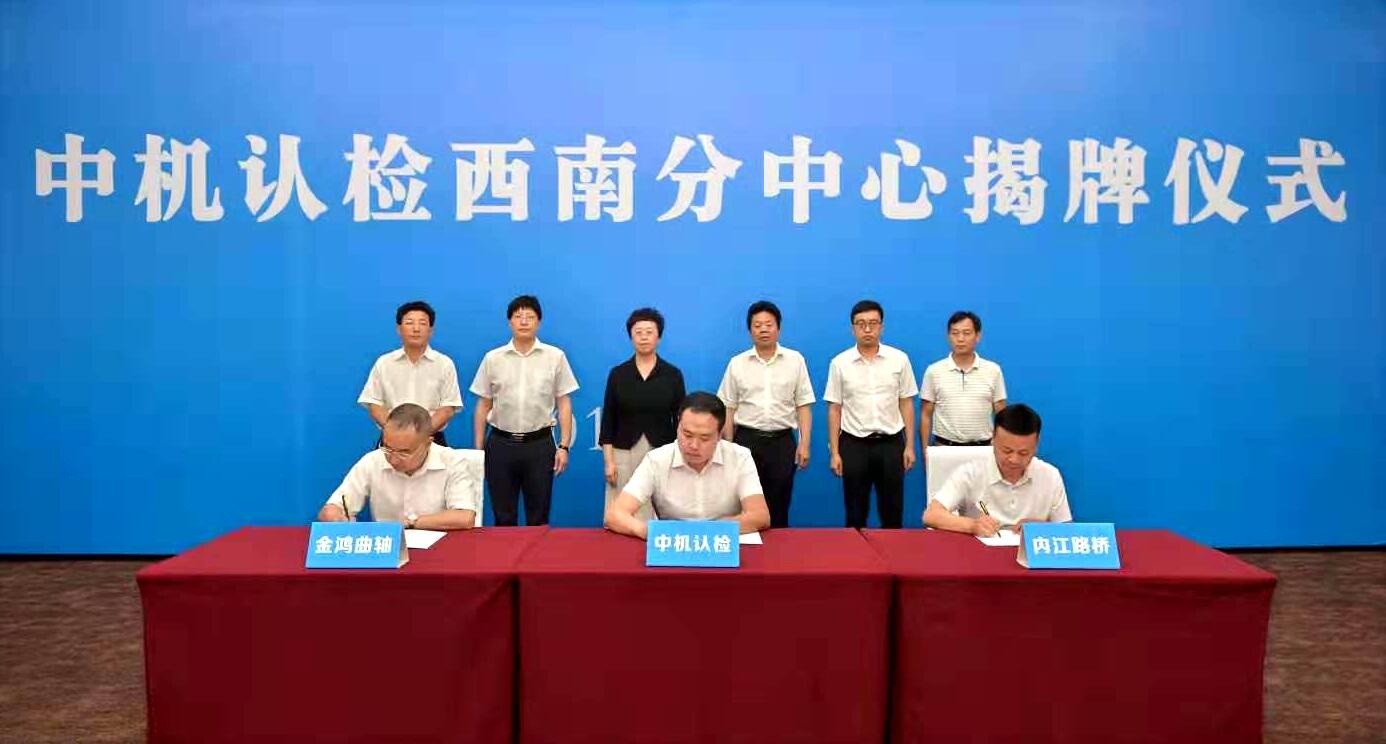 揭牌儀式上,中機寰宇認證檢驗有限公司、內江路橋集團、內江金鴻曲軸有限公司,簽訂三方戰略合作協議。根據協議,西南認證檢測中心項目擬建設認證檢測大樓、檢測檢驗線,建設覆蓋汽車及零部件、工程機械、航空地面機械檢測認證在內的綜合性認檢中心,力爭在5年內,打造國內一流的汽車及零部件檢測認證平台。