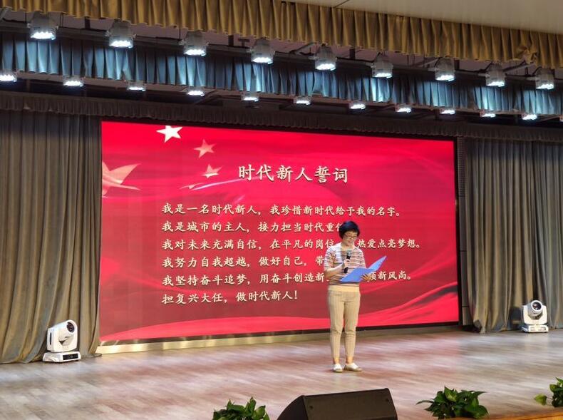 太原市第十二中學校高中語文教師趙旭代表時代新人宣讀《時代新人誓詞》:「我是一名時代新人,我珍惜新時代給予我的名字。我是城市的主人,接力擔當時代重任。我對未來充滿自信,在平凡的崗位,用熱愛鑄就輝煌。我努力自我超越,做好自己,帶動他人。 我堅持奮鬥追夢,用奮鬥創造新生活、引領新風尚。擔復興大任,做時代新人。」
