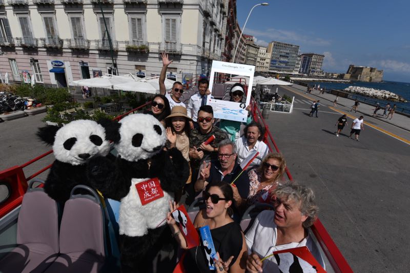 除此之外,馮喆還與兩隻「熊貓寶寶」登上一輛極具成都元素的雙層紅色熊貓主題巴士,向過往的當地市民和遊客熱情地打招呼。「熊貓寶寶」們邀請遊客們登上熊貓巴士,並向大家發出了一份來自熊貓故鄉的邀請——2021年,成都大運會見!這份特殊的邀約,引發了那不勒斯街頭狂歡。來自不同國家,說著不同語言的遊客在這一刻齊聲高呼:「I Iove Chengdu!」
