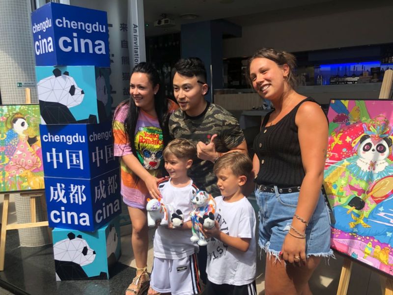 在書法體驗區和成都主題明信片書寫區,塗鴉大熊貓DIY活動更是吸引着小朋友的好奇目光。一位黃頭髮藍眼睛的小朋友,用畫筆在熊貓模型上寫下「chengdu」,他說:「我喜歡熊貓,我想去成都看大熊貓!」