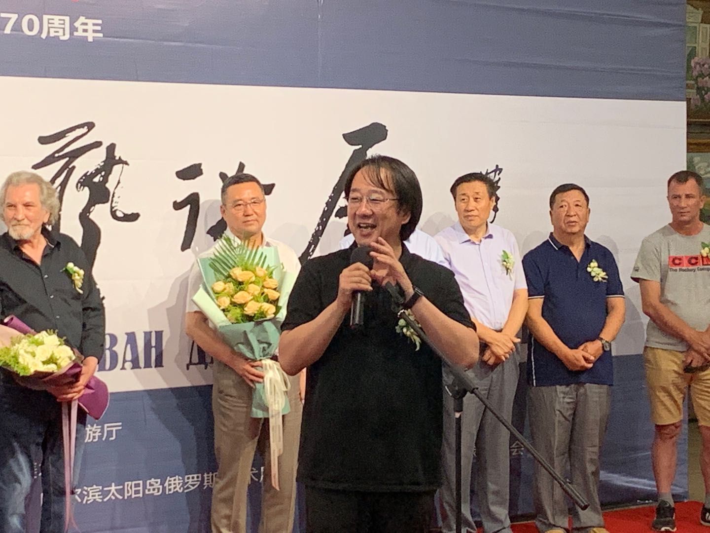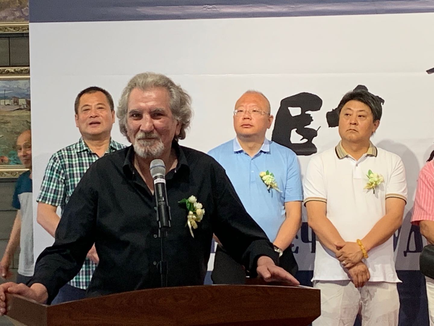 何帥臻致辭時說:「我特別感恩這片生我養我,培育我的土地。也要感謝我的好朋友劉明秀,這次畫展的姻緣促成得益於他。在數年前,我就以俄羅斯的城市人文為題材作畫,在黑龍江的這片土地上,能代表我們的文化,代表地域合作,那就是歐亞文化的碰撞形成的藝術呈現。現今,我們可以看到,中國文化在全球已經開始被人們廣泛接受,在俄羅斯尤為突顯。多年來,伊萬先生在中國畫了一批關於東方符號的展品,他對中國文化的理解和熱愛,可以從他的畫中充分地體驗出來。目前,以我們民間為代表的民間藝術展示活動,已然成為中俄兩國之間友誼的象徵和代表,這次展覽我的作品和伊萬先生作品就印證了中國建交70周年,這是一種天然的契合。」