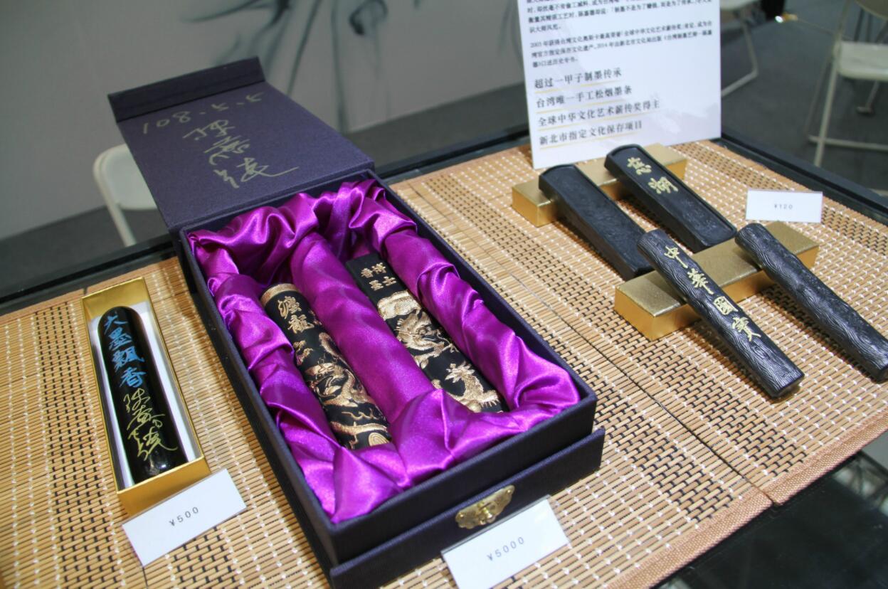 記者在現場看到,台灣精選形象館以「墨氣」為展覽主軸,最大亮點為展出「全球中華文化藝術薪傳獎」手工松煙墨陳嘉德大師制墨精品,陳大師親手製作的巨大墨條首次登陸公開展示。