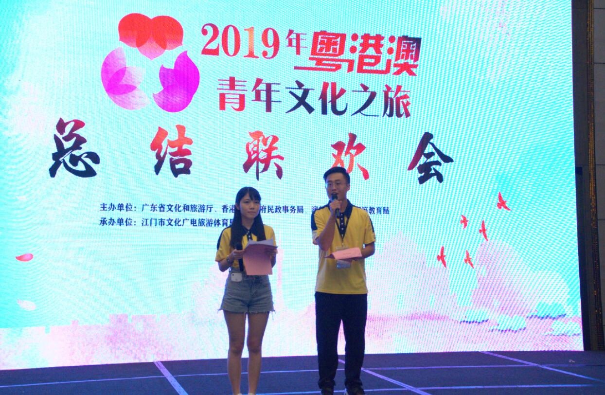 7月24日,由文化和旅遊部支持,廣東省文化和旅遊廳、香港特區政府民政事務局、澳門特區政府高等教育局聯合主辦,江門市文化廣電旅遊體育局承辦的2019年粵港澳青年文化之旅在江門舉行總結聯歡會。在聯歡會上,參加活動的全體學生一齊上台,用自編自導自演的文藝節目歡慶活動圓滿成功。粵港澳三地青年共同唱響《我和我的祖國》,為祖國歌唱、為粵港澳大灣區的美好明天祝福。