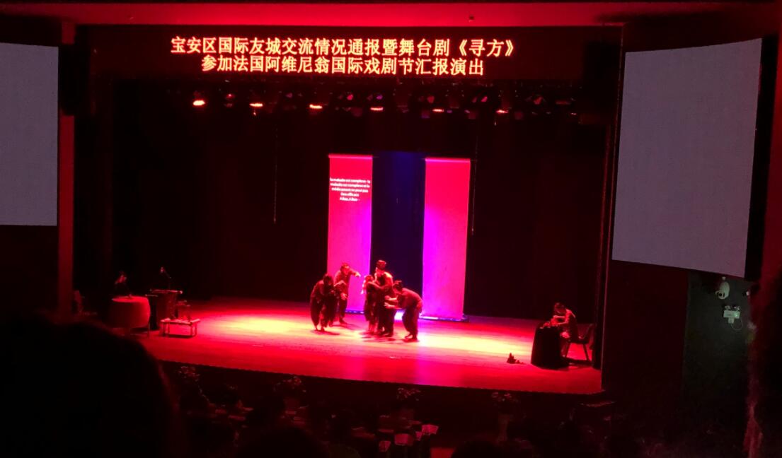 開演之前,寶安區副區長梁敏華致辭,介紹了寶安區國際友城交流情況,《尋方》的創作背景以及在阿維尼翁的演出情況。據悉,在中法友好交流的大背景下,近年來寶安區與法國阿維尼翁市交往日益密切,在文化、旅遊、體育等多個方面開展了廣泛而深入的合作。此前,寶安區委書記姚任訪問阿維尼翁市,雙方簽署合作意向書。寶安區派員參加了阿維尼翁市第二屆羅納河谷馬拉松,羅納河谷馬拉松組委會訪問寶安並參加了第二屆寶安國際馬拉松賽。2018年1月,阿維尼翁市副市長雅克·蒙達尼克訪問寶安,雙方簽訂友好交流合作備忘錄。同年7月,寶安區原創粵劇《夫人記》亮相第72屆阿維尼翁戲劇節,充滿嶺南特色的劇目引起強烈反響。2019年6月,省委外辦批覆同意寶安區與法國阿維尼翁市正式建立友好城區關係。同年7月,應阿維尼翁市政府邀請,舞台劇《尋方》亮相第73屆阿維尼翁戲劇節,豐富了寶安區與阿維尼翁市多層次合作的內涵,為兩地進一步深化合作奠定了良好基礎。