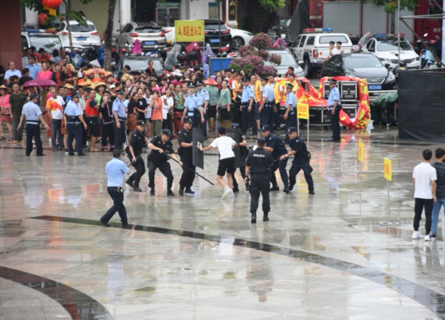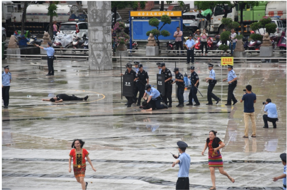 據了解,此次演練共有三場,第一場模擬暴雨中群眾觸電。第二場模擬群眾中暑。第三場模擬恐怖分子刀砍及歹徒縱火。保亭縣公安局、縣城管局、縣衛計委、縣消防大隊等多部門以及群眾演員近1000餘人參與演練。