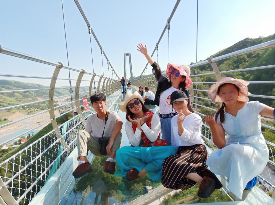 近日,「國運70 禮讚新疆」香港商報記者採訪團走進霍城縣大西溝鄉中華福壽山景區。記者在現場看到,玻璃景觀橋上人頭攢動。
