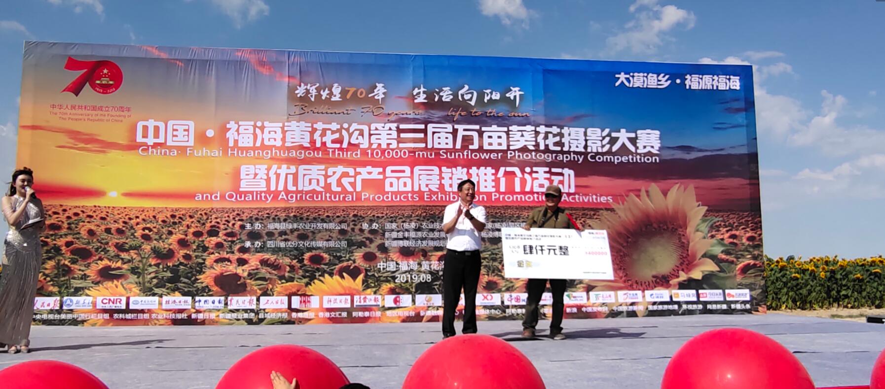 與會領導為第二屆福海黃花溝萬畝葵花攝影大賽一等獎獲得者獲4000元獎金