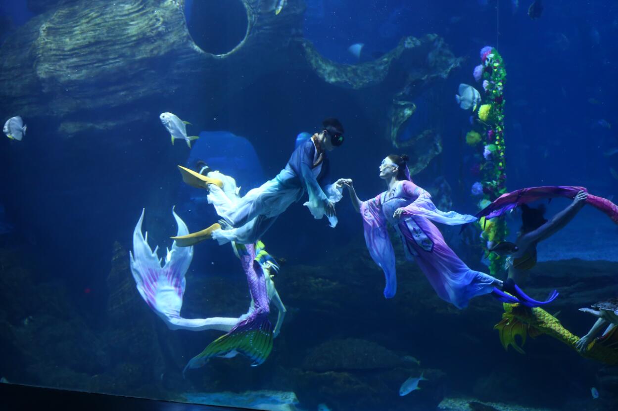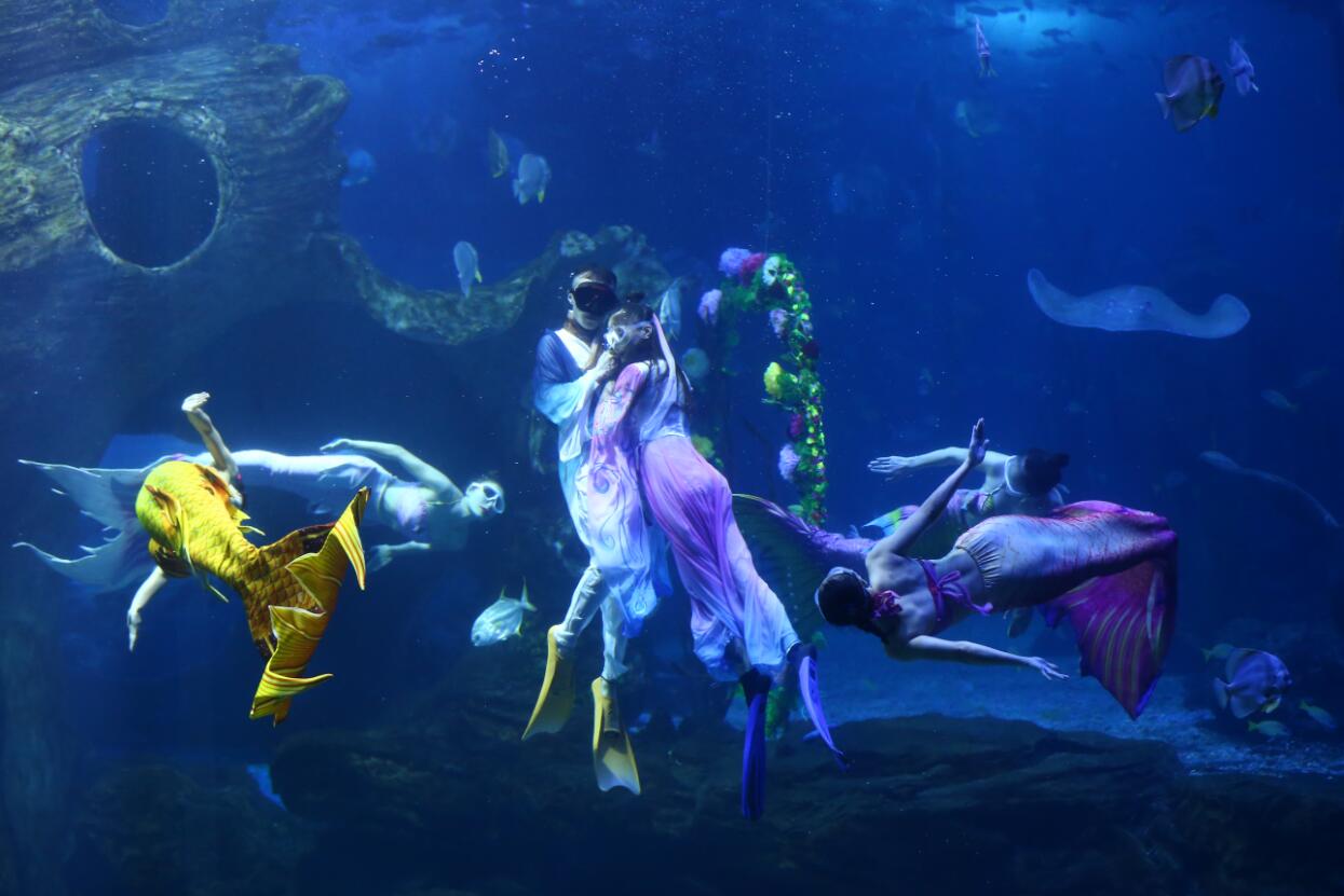 【香港商報網訊】為弘揚中國傳統文化,傳播正確的愛情觀,8月7日,多彩貴州城極地海洋世界的水下演員通過精心編排,把水下表演與傳統文化元素進行了有機結合,為遊客呈現了一段美麗動人的水下婚禮。