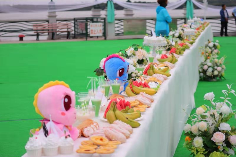 光影轉換中,現場觀眾撫今追昔,感慨萬千,也令今天的主角——27對新人更加珍惜現在的幸福生活,對美好的未來充滿期待。當他們身着華麗的新婚禮服,伴隨着《婚禮進行曲》的旋律,一雙雙、一對對攜手相依,深情款款地走上台來時,人們用熱烈的掌聲為他們送上了誠摯的祝福。一時間綵球飛舞,花團錦簇,江畔頓時成為了歡樂的海洋。品嘗一顆朱古力糖果,祝福新人風雨同舟,苦樂共享;中俄新人互換禮物,共飲一江之水,祝福兩國友誼地久天長;在氣球上寫下對自己、對生活、對祖國的美好願望,讓飄揚的色彩放飛心中的希望——祝福祖國繁榮富強,祝願生活蒸蒸日上;主辦方還為每對新人精心準備了一份具有地域文化特色的禮物,用恐龍、界碑、城標等元素組成的「嘉蔭」二字,他們將帶着這份珍藏着美好時光的禮物走向幸福的生活,並將心中的喜悅分享、傳遞給現場的每一個人……