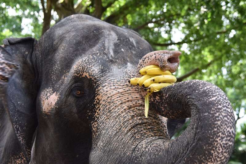當天上午,深圳野生動物園飼養員為該園大象準備了蘋果、香蕉、西瓜、火龍果等蔬果。「蔬果大餐」色味俱佳,引得大象垂涎三尺。只見飼養員一聲令下,聰明的大象用靈巧的鼻子捲起一大串香蕉往嘴裏送,香蕉還未完全吞下,又捲起了整隻火龍果,吃相霸氣十足。幾十公斤的蔬果不一會功夫就被吃個精光。