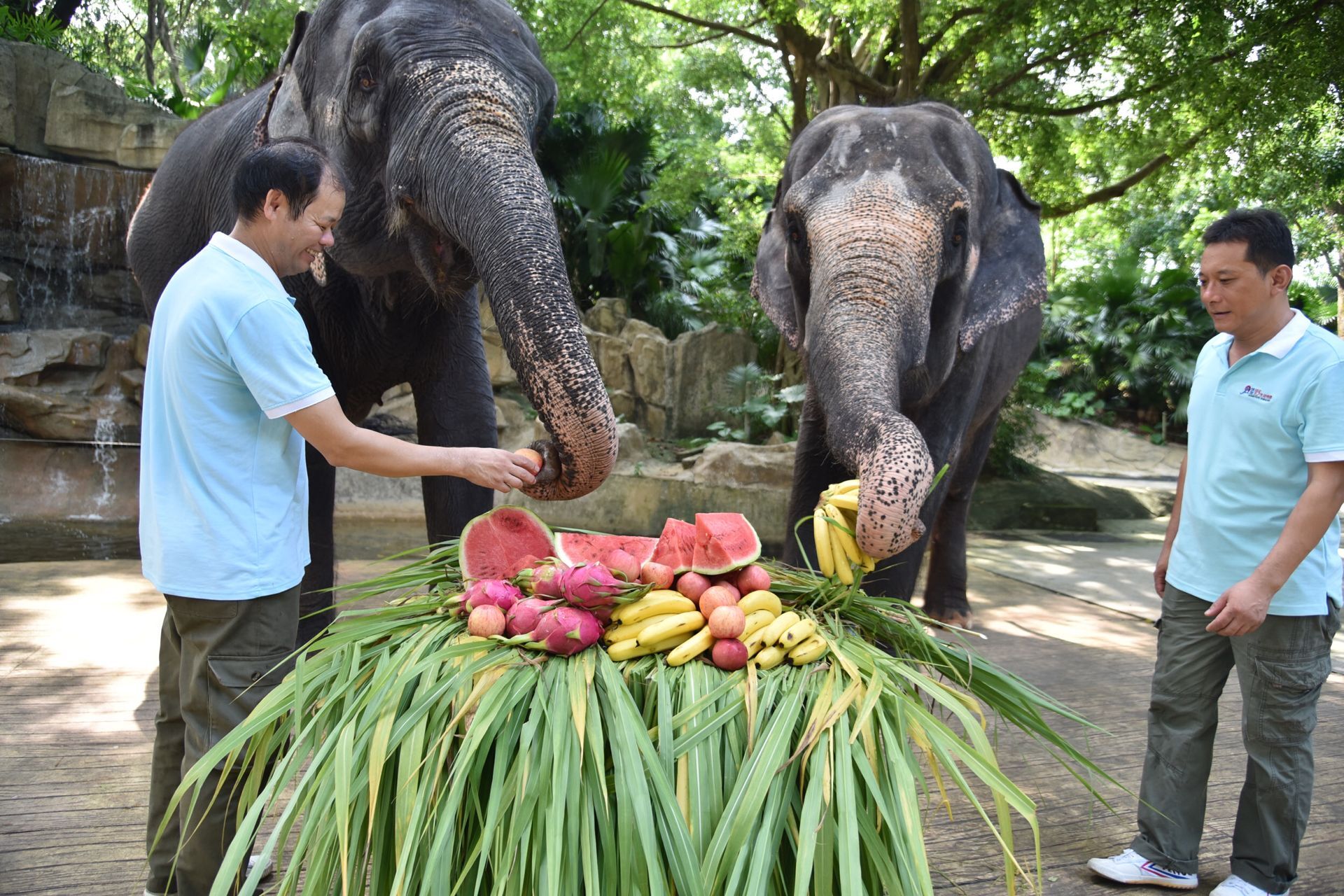 【香港商報網訊】8月12日是「世界大象日」,深圳野生動物園為園內的大象準備了豐盛的蔬果大餐。大象們因此獲得屬於自己的特色節日大餐,美滋滋的大吃一頓。