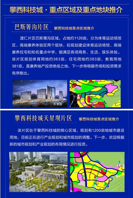本次推介會還重磅亮相了攀枝花7塊重點區域:攀西科技城的巴斯箐溝片區和天星壩片區;東區的炳四區片區、阿署達片區;西區大水井新區、新莊物流園片區;仁和區的攀枝花高鐵站片區。這七大重點區域各具特色,投資潛力巨大,下一步將根據市場情況和投資需求可擇機推出。