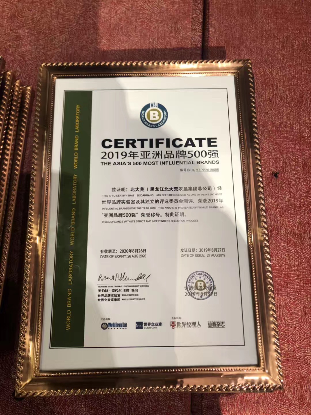 據悉,「北大荒」品牌已連續多年榮登由世界品牌實驗室發佈的《中國500最具價值品牌》榜單,「北大荒」品牌價值從2017年的568.12億元位列58名,上升到2019年的789.18億元位列52名,較2018年682.75億元增長106.43億元,增幅15.59%,排名提升2名。