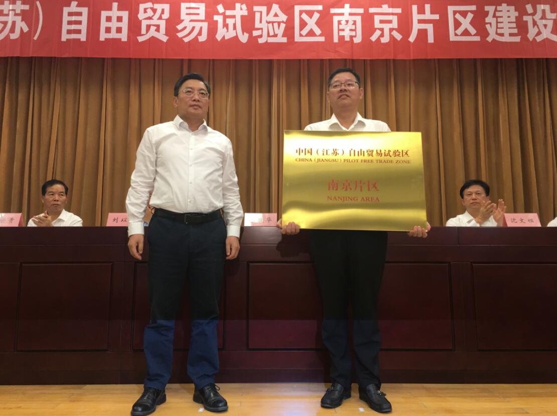 江蘇省委常委、南京市委書記張靜華(左)為中國(江蘇)自由貿易試驗區南京片區授牌