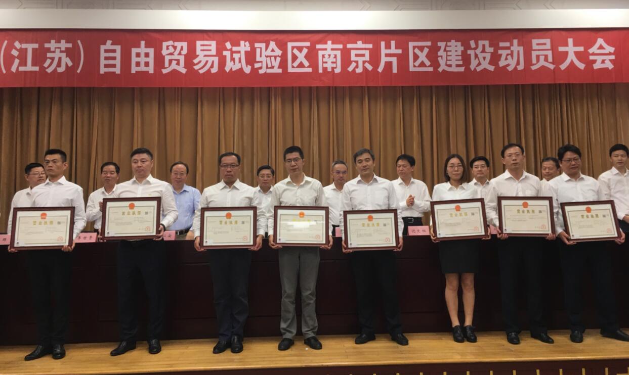 中國(江蘇)自由貿易試驗區南京片區建設動員大會舉行,首批12家企業領取營業執照