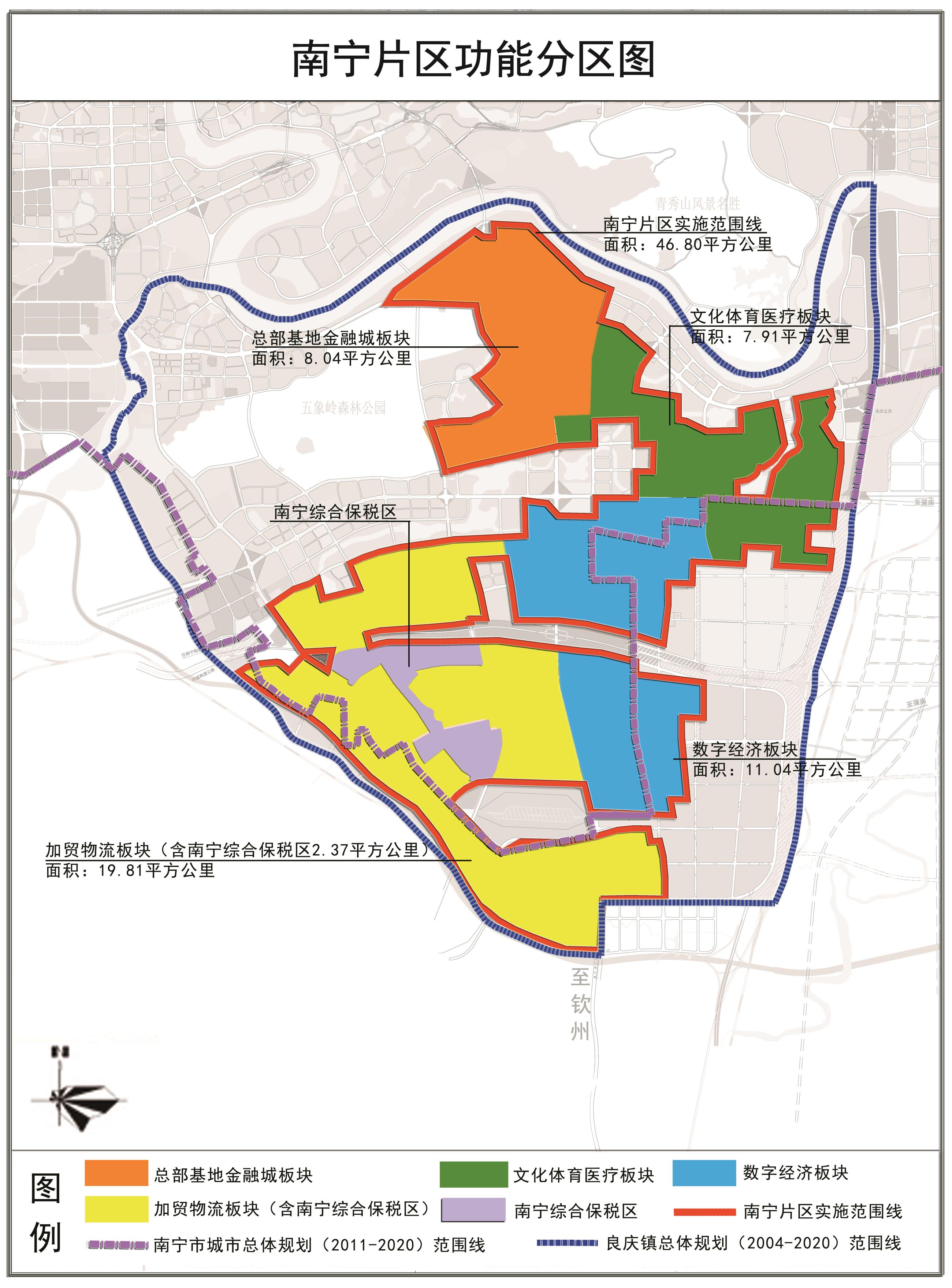 據悉,南寧片區實施範圍46.8平方公里,依託五象新區紮實的發展基礎,既有首府優勢,又有政策疊加、資源富集和規劃先導優勢,更是與中國—東盟信息港、廣西建設面向東盟的金融開放門戶、南寧跨境電商綜合試驗區、西部陸海新通道等多個國家戰略平台形成疊加優勢,將重點建設現代金融、數字經濟、文體醫療、加貿物流四大功能板塊。