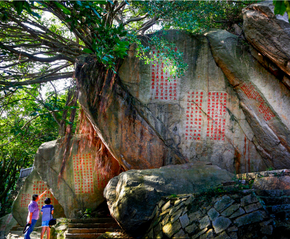 遊盪在九日山的山峰之間,看到每塊石頭幾乎都有刻字,所謂的「無石不刻字」果真名不虛傳,宋元明清代代不歇。其中有一方最年輕的石刻:「在九日山最後一次祈風典禮之後七百餘年,我們,來自非洲、美洲、亞洲和歐洲的聯合國教科文組織海上絲綢之路國際考察隊員,乘坐阿曼蘇丹提供的『和平號』考察船來到這裡,作為朝聖者,我們既重溫這古老的祈禱,也帶來了各國人民和平的信息,這也正是聯合國教科文組織絲綢之路——對話之路綜合研究項目的最終目標。為此,特留下這塊象徵友誼與對話的石刻。」。