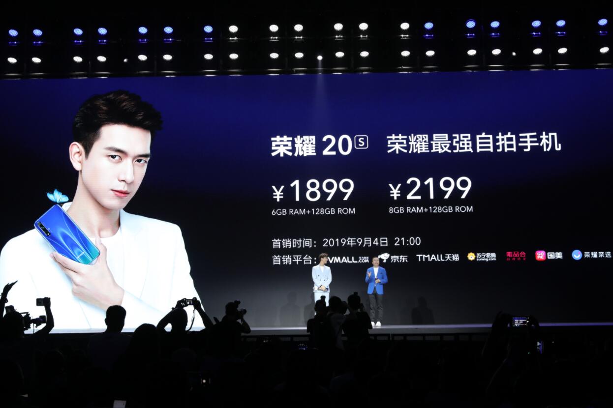 榮耀20S共推出兩個版本,6GB+128GB版本售價1899元,8GB+128GB版本售價2199元,提供蝶羽藍、蝶羽白、蝶羽黑三款配色。新機將於9月4日21: 00在VMALL商城、京東、天貓、蘇寧易購、唯品會、國美、榮耀親選七大線上平台及線下同步發售。