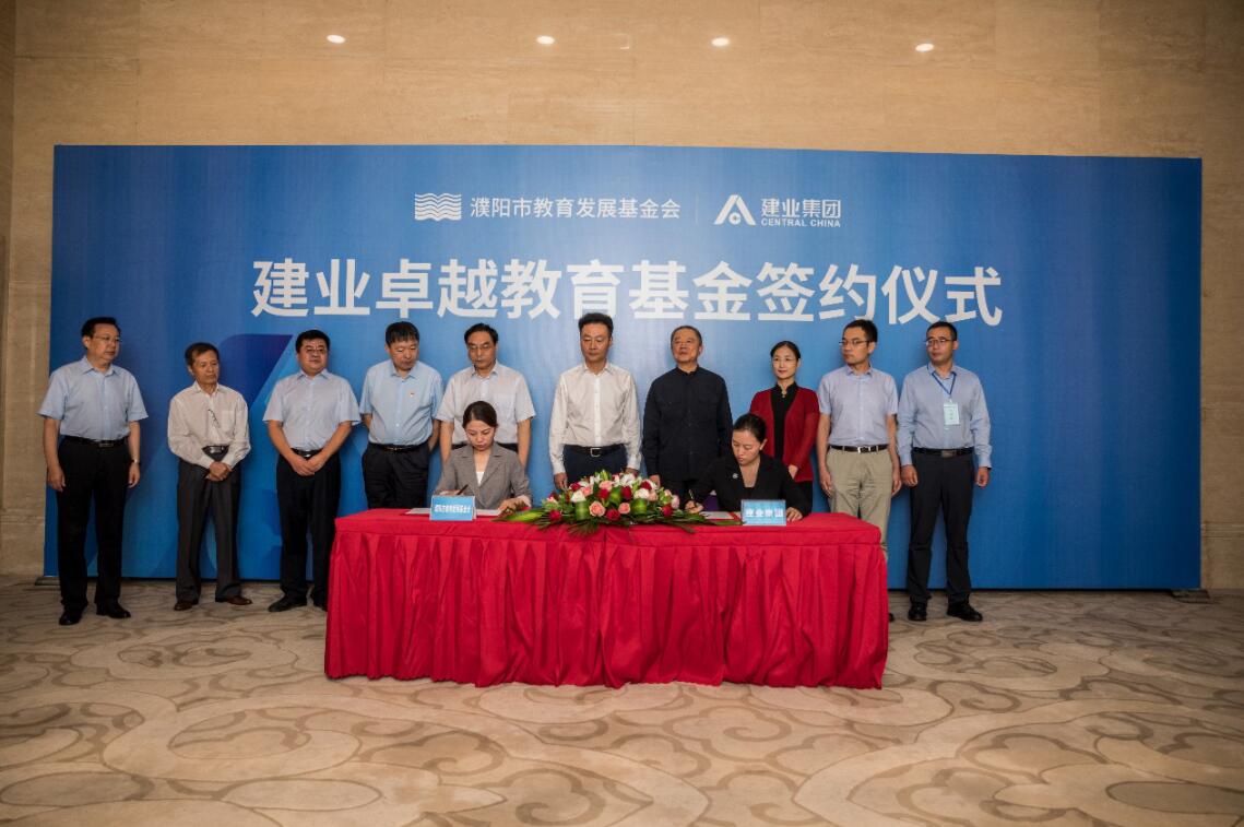 捐贈簽約儀式上,在濮陽楊青玖市長、孫永振副市長、建業集團胡葆森董事長的共同見證下,濮陽市教育發展基金會與建業集團代表共同簽署捐贈協議。