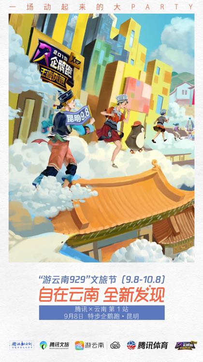 【香港商報網訊】記者 劉曉寒 報導:9月8日,由騰訊體育和「游雲南」聯合主辦的「2019特步企鵝跑」在昆明開跑,1000餘名參賽者聚集昆明公園1903凱旋門廣場,邊跑邊玩,以「王者快跑」為主線共跑完3公里、闖過5個關卡。隨着企鵝跑昆明站的開跑,也標誌着「游雲南929」文旅節正式啟動。現場,騰雲公司首席運營官王治權為本次企鵝跑做開場發言,並宣佈為期一個月的「游雲南929」文旅節啟動。
