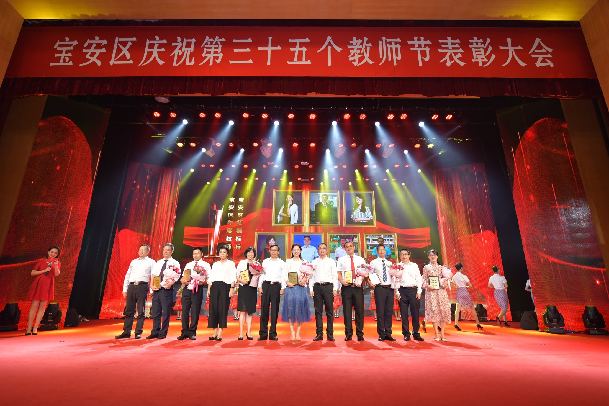 教師是教育的基礎,近年來,寶安堅持「外引內培」,穩步提升師資力量,近三年引進國內外知名高校優秀畢業生1500餘名,全區共有30年以上從教經驗的教師305人。近一年裡,倪崗、唐雲波團隊獲兩項國家級基礎教育教學成果獎,實現全省一等獎零的突破;王棟昌獲評「全國模範教師」。大會對過去一年裡湧現的先進單位和先進個人進行表彰,授予了年度教師、師德標兵、教育改革年度人物、教育工作突出貢獻獎等榮譽。