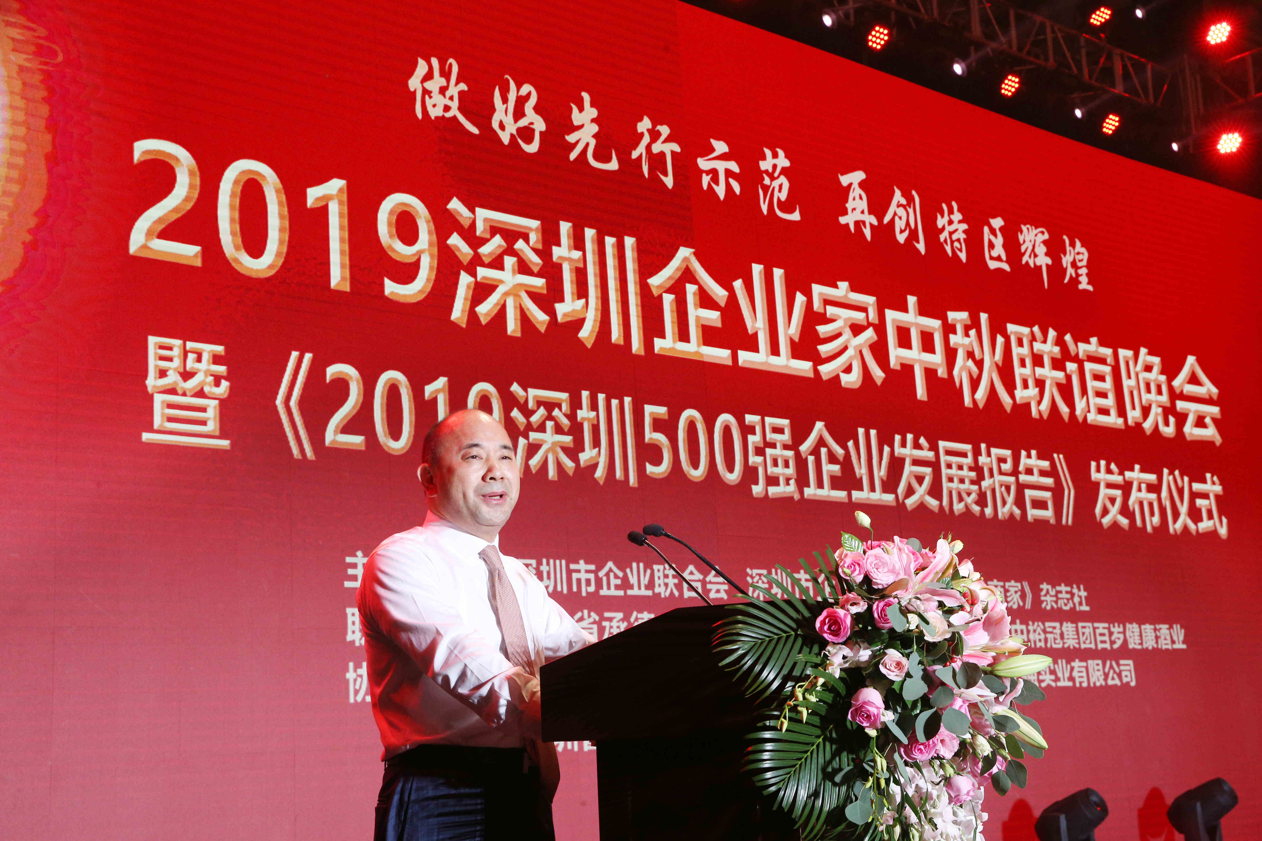 今年,是我們中華人民共和國70年華誕,也是深圳市建市40周年,前不久中央支持深圳建設中國特色社會主義先行示範區,這是《粵港澳大灣區發展規劃綱要》出來之後對深圳而言又是一個重大的利好,這個利好它不是一般的利好,我相信這個利好是我們40年的一個分水嶺。我們在座的企業家和在座的領導都可以見證到這個偉大的時刻,從今天開始。我們不僅佔據了天時地利,還加上今天中秋團圓的人和,我們又一起佔據了人和的優勢,天時地利人和在一起,相信我們深圳,相信我們深圳的企業家會再創造新的輝煌。