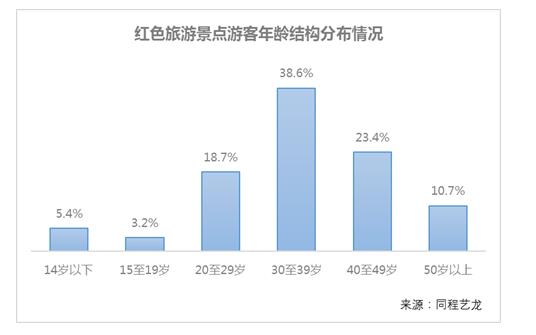 《報告》基於同程藝龍景點大數據的分析顯示,紅色旅遊景點的遊客年齡結構相對年輕,其中,14歲以下的中小學生佔比5.4%,20至39歲青年群體佔比57.3%,整體青少年及青年人群占絕對多數。