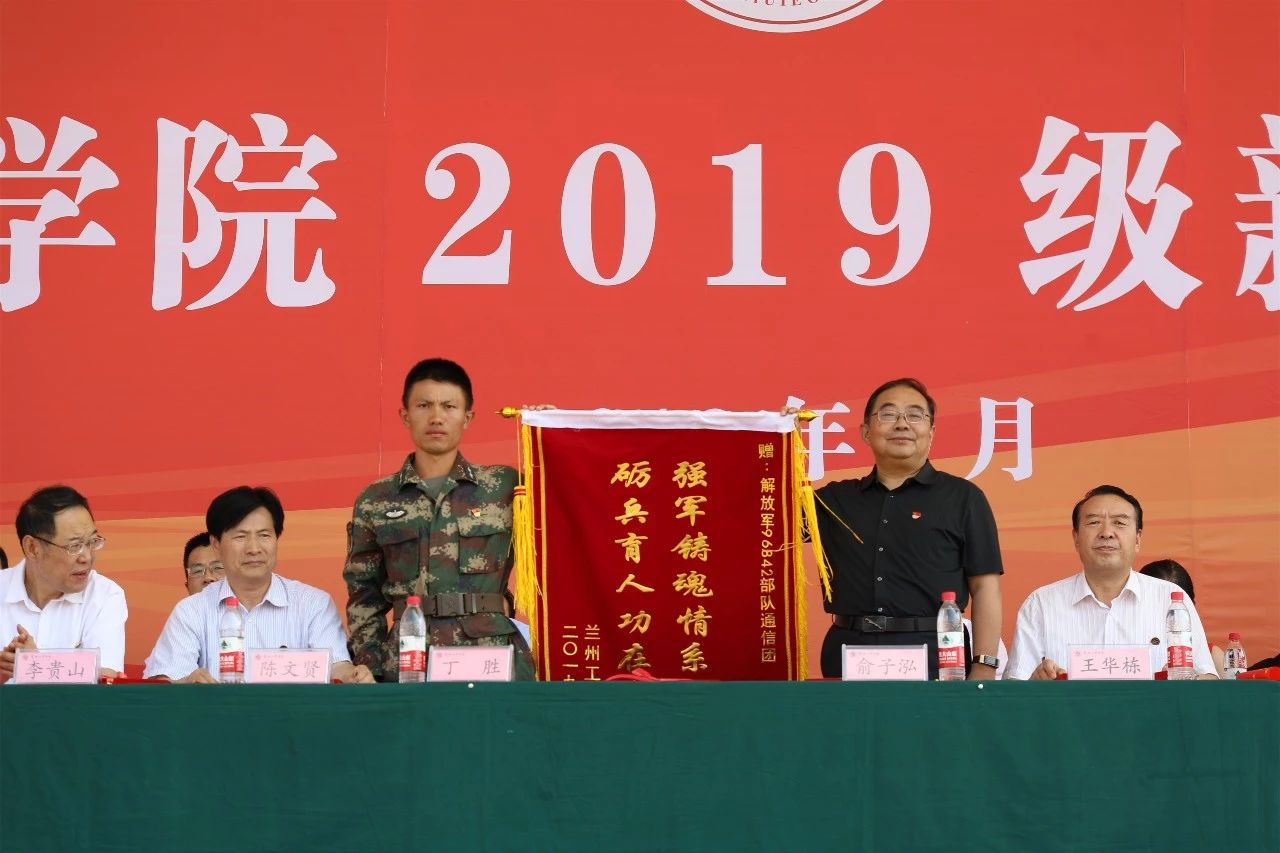 蘭州工業學院黨委書記俞子泓代表學校向軍訓承訓部隊贈送錦旗(許富貴 攝)