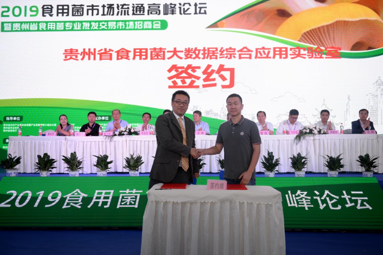 當天會上,出席會議相關領導宣讀了貴州省菌物學會關於成立羊肚菌產業分會的批覆並為理事會成員頒發聘書,同時為貴州省食用菌專業批發交易市場最具影響力商戶以及貴州食用菌市場高峰論壇突出貢獻獎單位和個人頒發榮譽。貴州省民生大數據綜合應用工程研究中心主任周宇航與貴州易農雲大數據有限公司總經理溫品發籤訂了聯建貴州省食用菌大數據綜合應用實驗室。