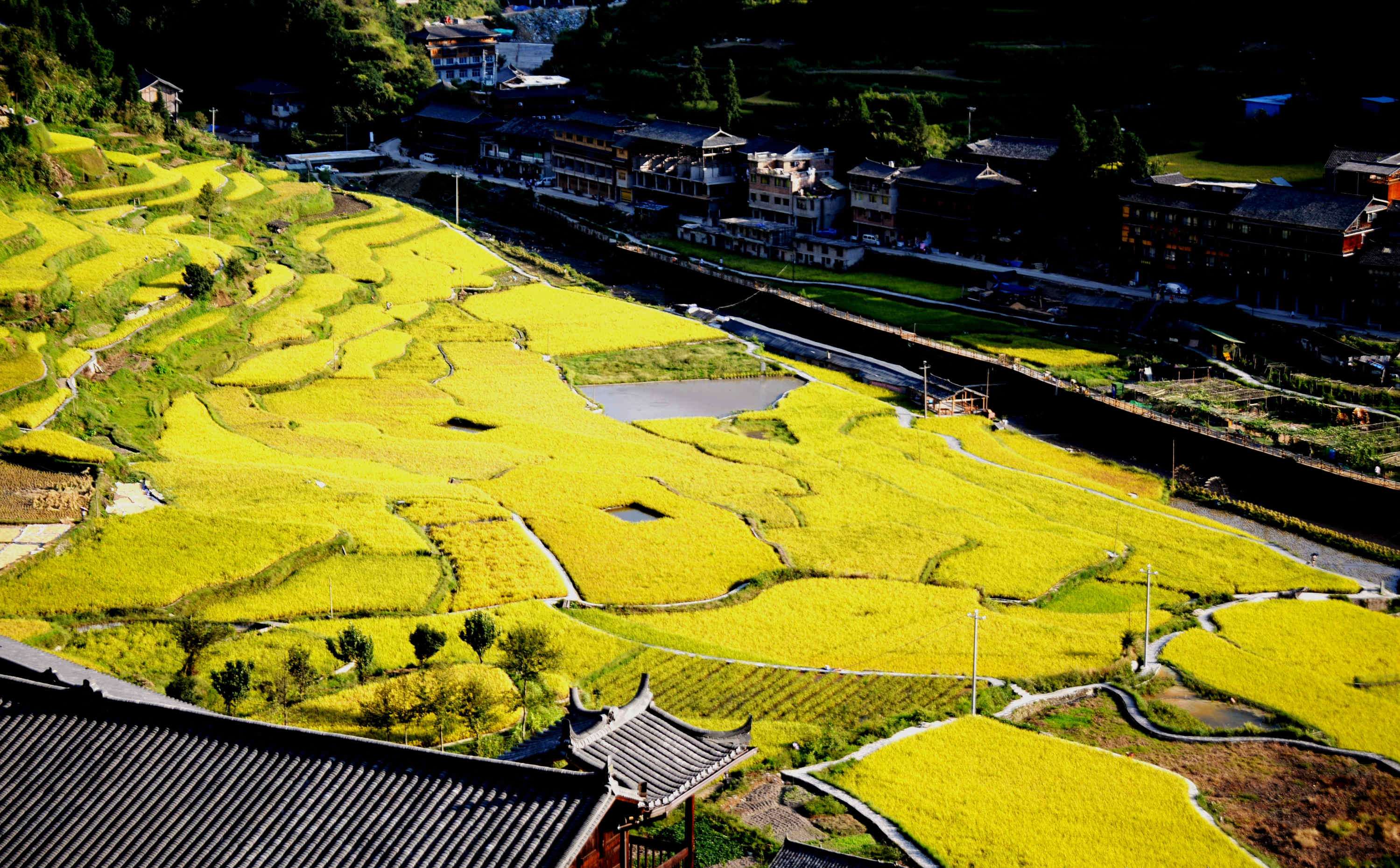 從山頂蜿蜒到山腳的梯田裡,入眼儘是金燦燦的稻子,有的甚至就在吊腳樓下,一派秋色美不勝收。在秋風颯爽中行走其間,顆粒飽滿的稻穗隨風搖曳,田裡稻浪翻騰,金光閃閃,與長天秋水,鳥語蟲鳴交織,美得讓人沉醉。