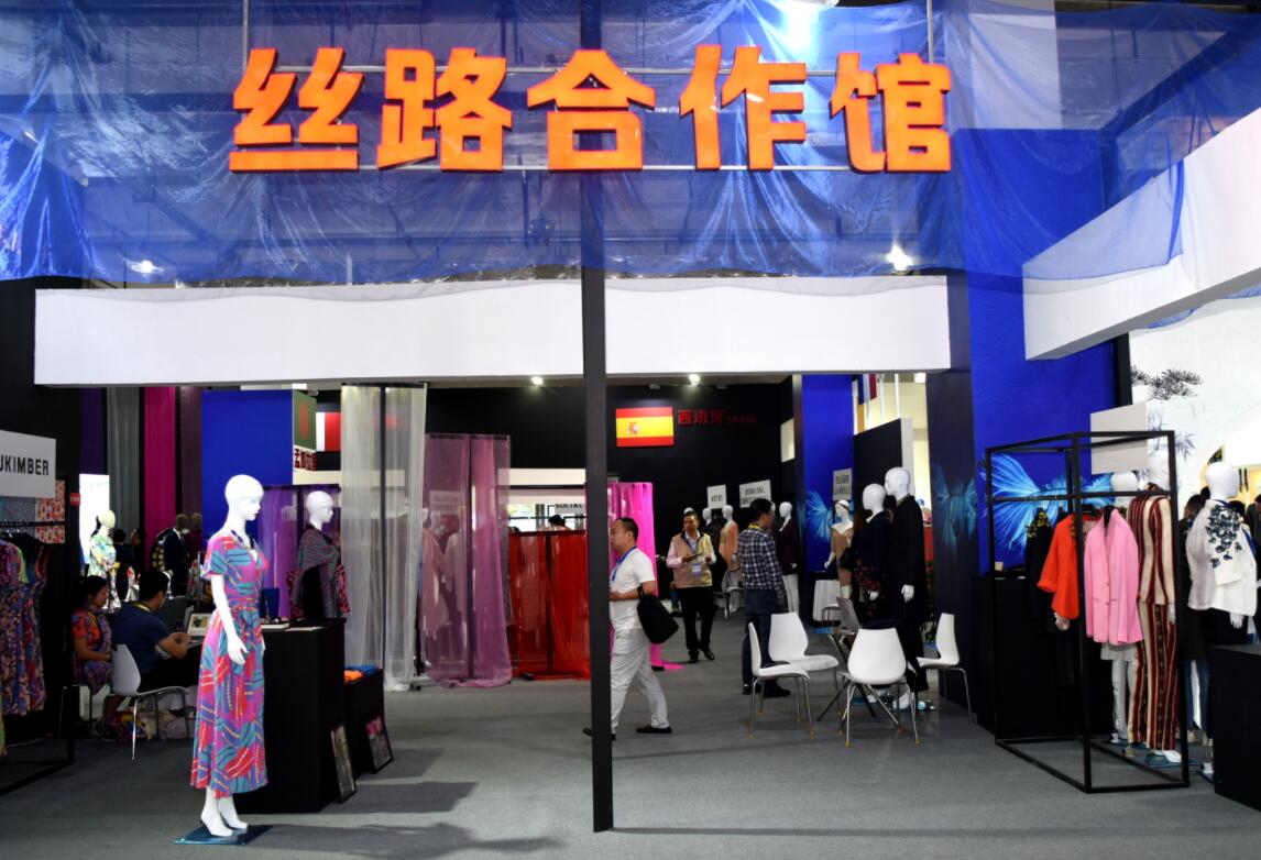 絲路合作館,主要展示「絲綢之路」沿線國家部分企業絲紡服裝及特色產品