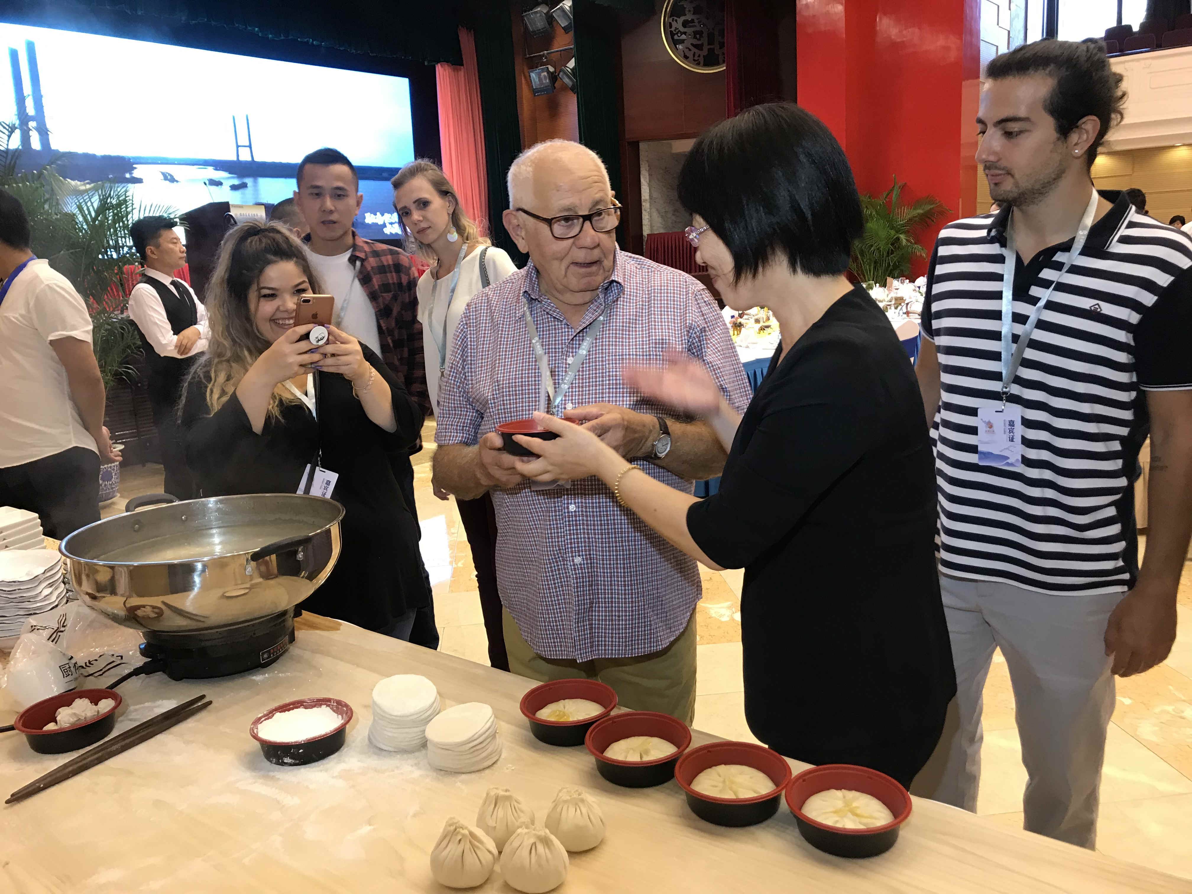 來自西班牙的老爺爺Marc Pozuelo一邊品嘗着淮揚美食,一邊興高采烈地與廚師、觀展市民合影留念,「在這裡可以放鬆地品嘗到中國的各色傳統美食,並且每一個人都是那麼地友好,即使語言不同也無妨,因為美食能夠超越言語,拉近你我彼此的距離。」此外,他還品嘗了一杯淮安的今世緣白酒,喇舌的口感雖讓他微微顰眉,但隨後他還是豎起拇指並打趣地說到:「或許在喝下這杯之前,應該有人提醒我一下白酒如此之烈。」
