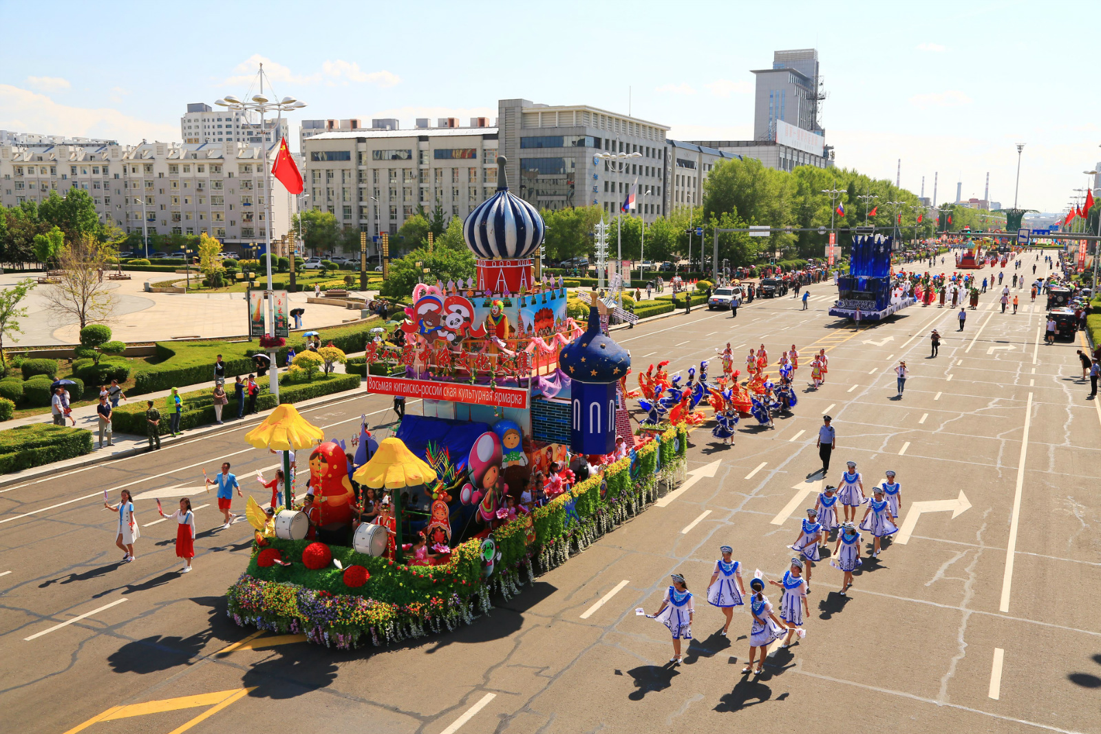 2018年6月28日,黑河市舉辦第九屆中俄文化大集——「一城兩國 炫彩中俄」中俄民眾花車巡遊暨中俄民族風情展演(資料圖)