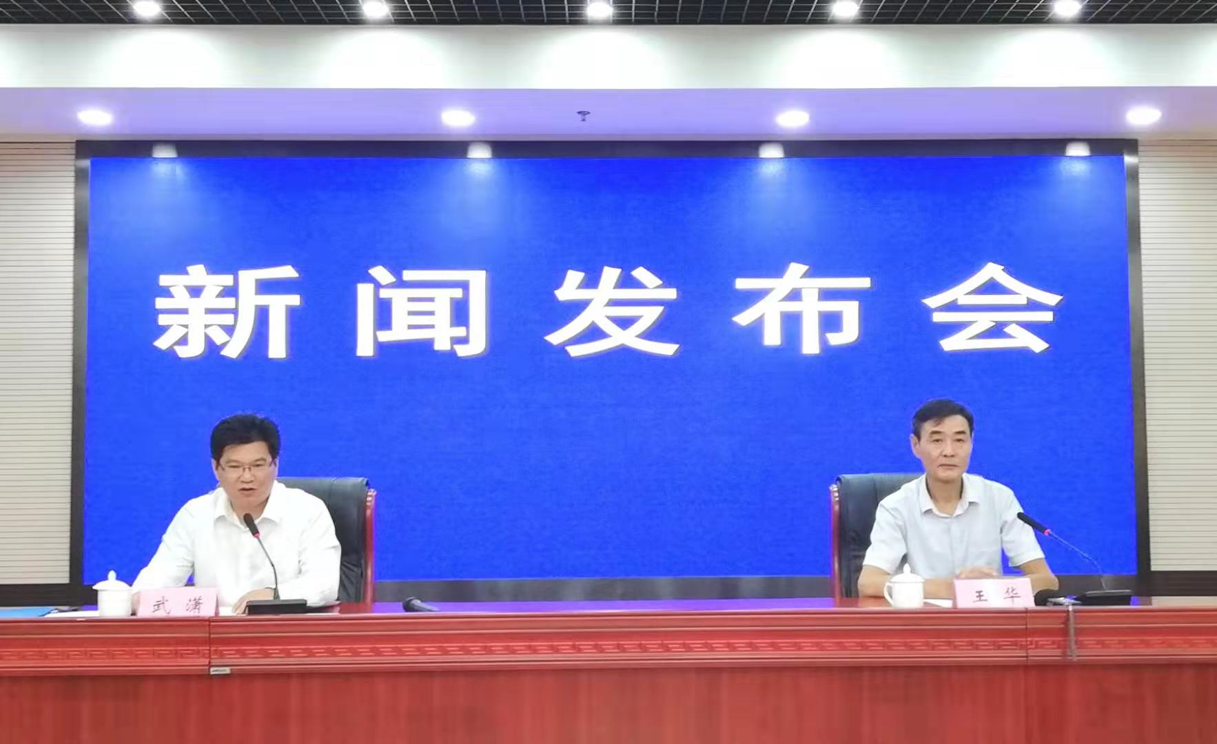 中國安徽名優農產品暨農業產業化交易會(2019.合肥)新聞發佈會現場,左,安徽省委宣傳部新聞發佈處處長武瀟主持新聞發佈會,安徽省農業農村廳副廳長王華介紹相關情況並回答記住提問(孫軍/攝)