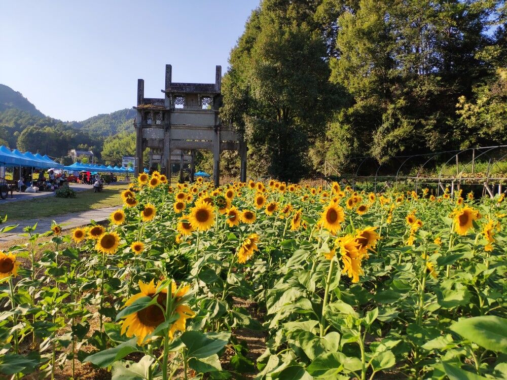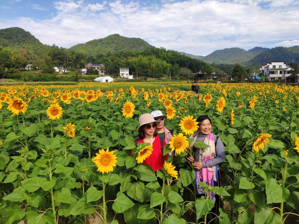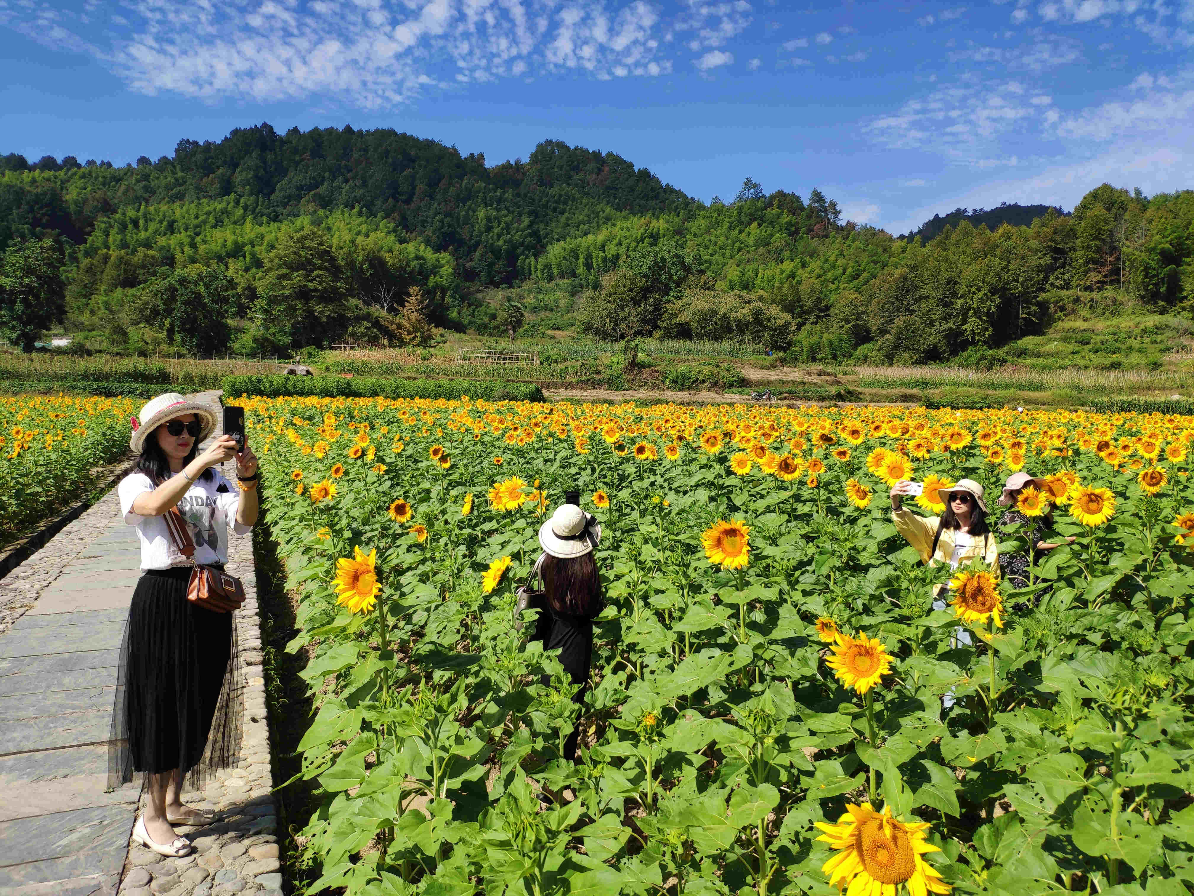 據悉,蜀源向日葵一般7月底開始錯開播種,葵花盛開季恰逢中秋、“十一”國慶長假,花期可達2個月,自2013年蜀源村向日葵旅遊基地打造以來,遊客不斷增加,如今花期客流量可達10萬余人次,成為黃山市重要的賞花景點。向日葵基地提升了蜀源村的知名度,也帶動了周邊民宿、農家樂等旅遊配套產業的發展,據統計,該村農家樂、民宿10餘家,直接或間接帶動60余名農戶就業、人均增收千餘元。今年花期,當地政府在基地統一搭建66個攤位供農戶銷售自家農產品,真正實現美麗鄉村向美麗經濟轉變,讓鄉村美景帶動村民脫貧致富。(吳敏 閆豔 江迨)