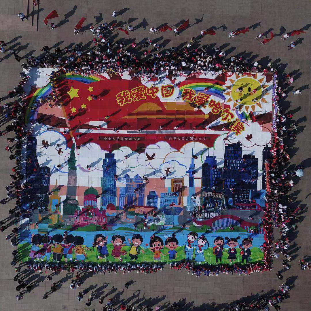 「繪城市宏圖 為祖國慶生」千人共繪大板畫活動中,有來自全市的520個學生家庭、近1600人在531平方米的畫板上,共同繪製冰城美景,盡展盛世歡歌的場面。520個家庭,寓意「我愛你」中國;畫卷總面積531平方米,比擬哈爾濱總面積5.31萬平方公里。來自道里區的六所小學的部分班級集體報名參加了此次活動。孩子們和小夥伴們一起,拿起手中的畫筆,用色彩塗抹自己家鄉的美麗,完成對新中國成立70周年的慶祝和獻禮。