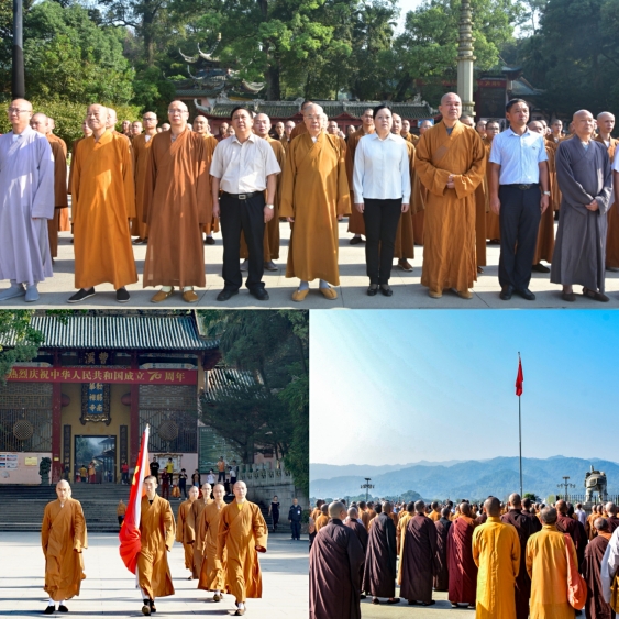 【香港商報網訊】記者 李芳 報導: 29日上午9時,在雄壯的國歌聲中,韶關市佛教協會在南華禪寺曹溪廣場舉行了莊嚴的升旗儀式,慶祝中華人民共和國成立70周年。隨後在南華禪寺曹溪講壇舉辦了愛國祈福法會、座談會、書畫筆會以及主題為「不忘初心 砥礪前行」的圖片展,通過系列活動,充分展示了韶關佛教及南華禪寺的發展歷程和社會貢獻,引導廣大僧眾不忘歷史,不忘初心,培養愛國愛教的良好品質,獻禮中華人民共和國成立70周年。