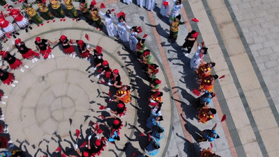 領唱用高亢的嗓音開唱,迅速聚焦了人們的目光,公園裡忙碌的環衞工人、晨跑青年、太極拳和瑜伽練習等各個群體都被吸引過來。
