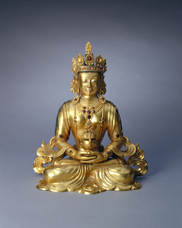 崇敬殿是重華宮的前院正殿,也是進入展廳的第一重空間。暖閣里的金無量壽佛,是宮廷陳設的藏傳佛教文物精品,展現了乾隆對佛教的篤信。樂善堂位於正殿空間的中央,其名稱則是乾隆皇帝學習大禹「樂取於人以為善」精神的表現。每年正月上旬,乾隆都會在此欽點親近的宗室、大學士、內廷翰林等到此品嘗三清茶、舉行茶宴聯句,作為君臣之間聯絡感情的消遣。著名才子紀曉嵐、名臣劉墉等都曾是這裡的座上賓。