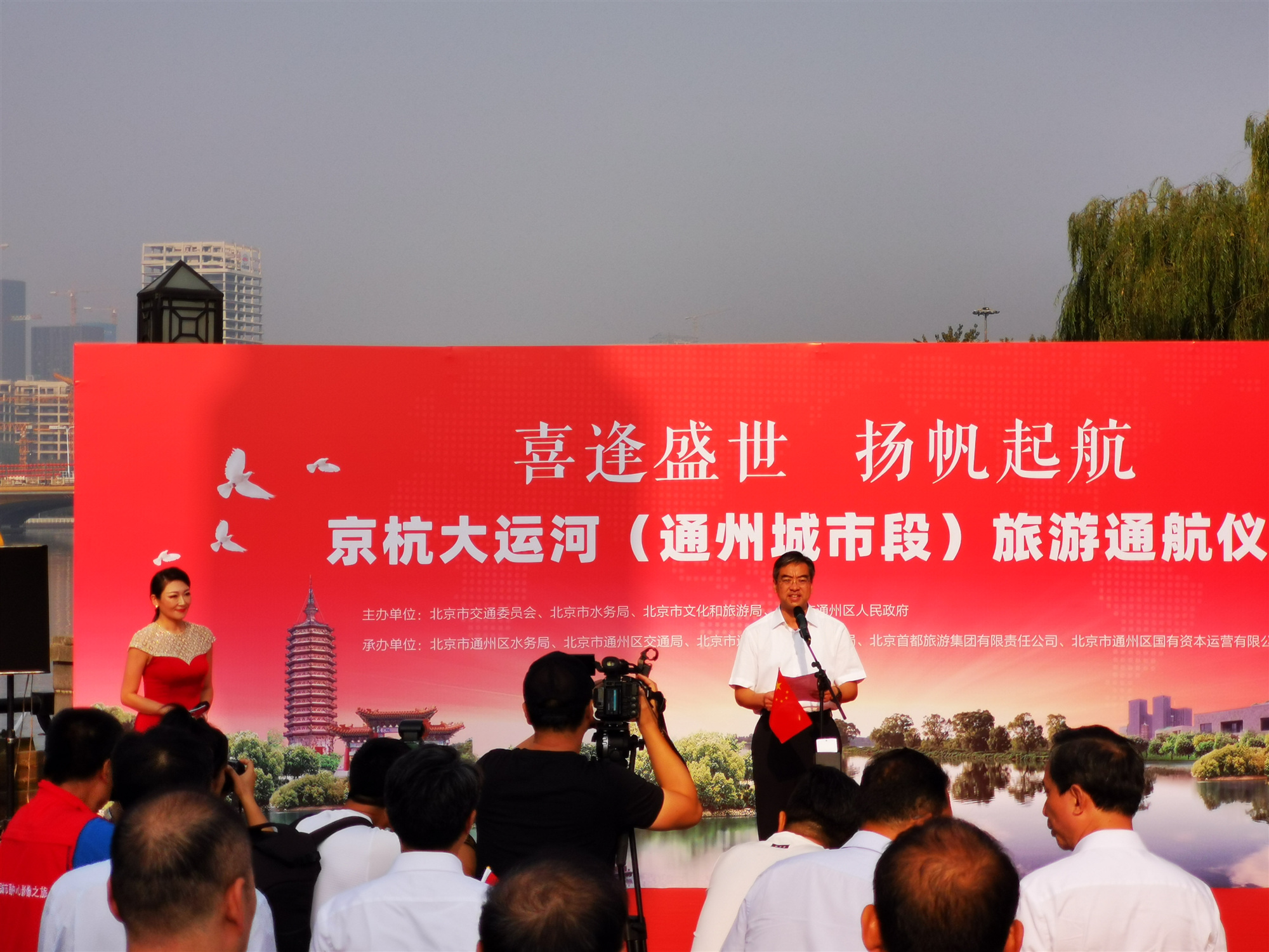 京杭大運河通州區城市段通航儀式現場,通州區區委書記曾贊榮做通航致辭
