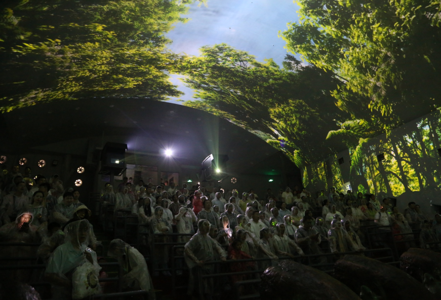 《風雨情深》海島颱風體驗館掩映在雨林叢中,橢圓形的外觀以綠葉點綴,象徵著“綠色地球,美好家園”的吉祥寓意。走進劇場內,270度穹頂劇場的獨特造型讓人仿佛回溯到千年前那個風雨飄搖的暴風雨之夜。
