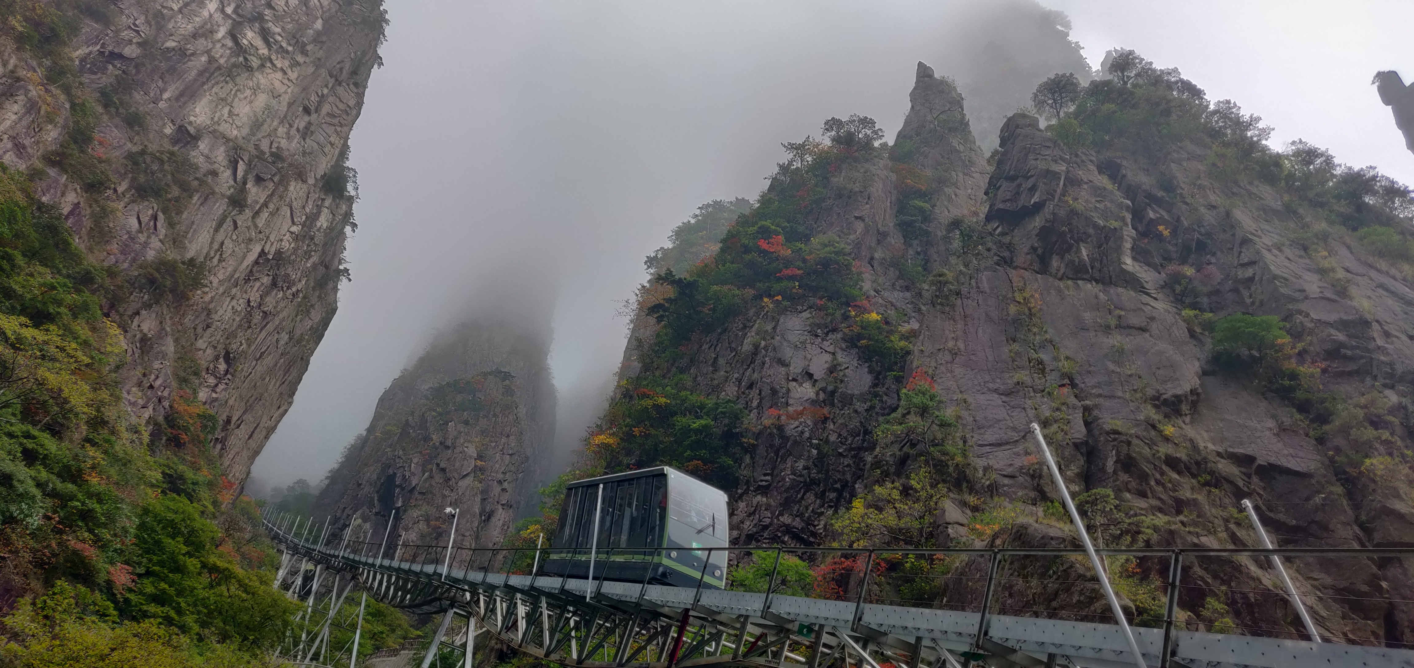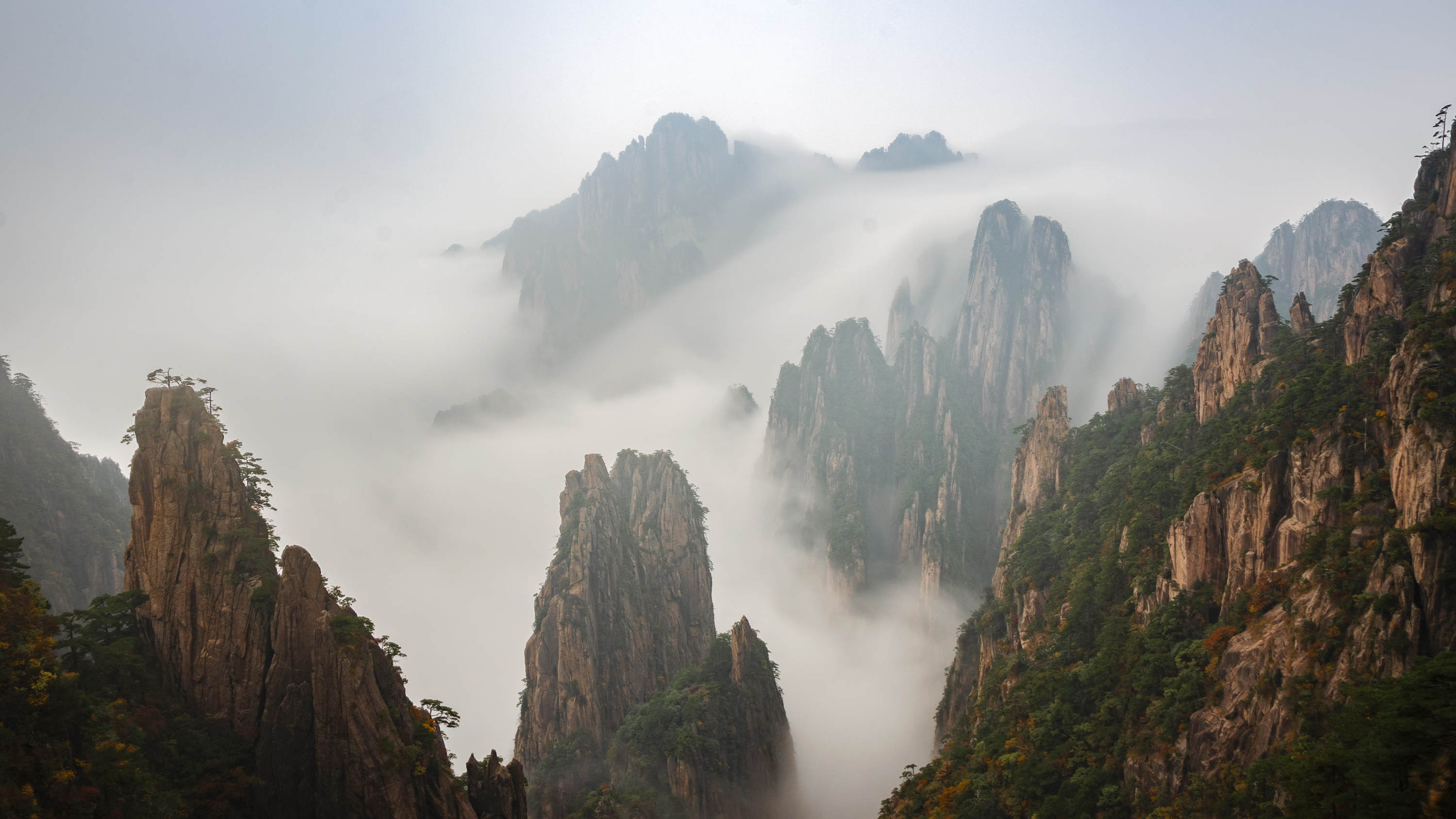 十月是黃山賞秋的絕佳時節。國慶黃金周以來,黃山秋色漸濃,峰巒溝壑間,星星點點的深紅、淺紅、黃色、鵝黃點綴在蒼翠的青松之間,仿佛是五彩的錦繡。有的山谷中,成片紅、黃色的樹木縱向生長,好像給巍峨的山峰披上了一條條斑斕的彩帶。
