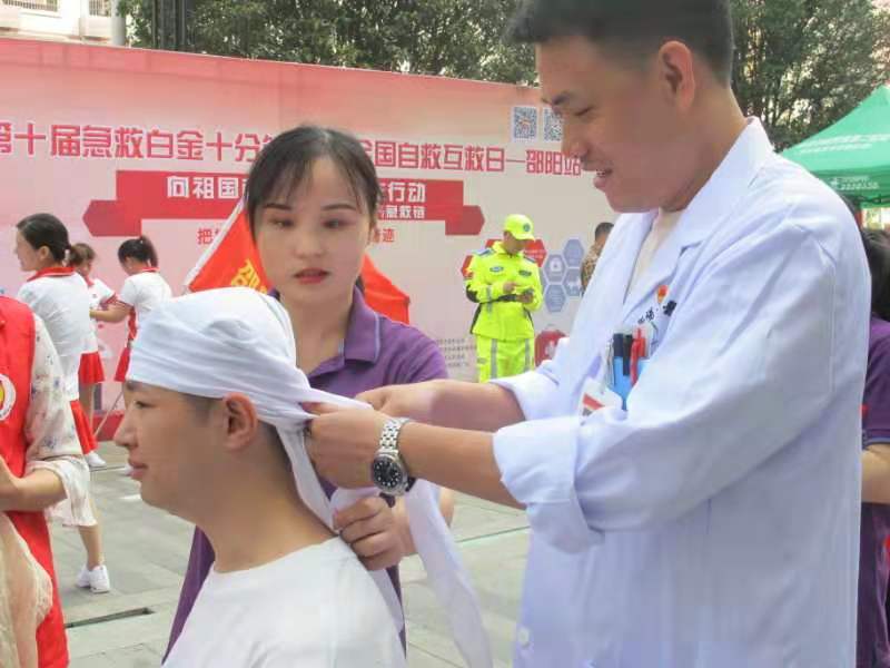 當天上午,由邵陽市紅十字會、市衛生健康委員會主辦,邵陽市中醫醫院承辦,邵陽學院附屬第一醫院、邵陽市緊急救援協會、邵東藍天救援隊等22家單位協辦的第十屆“急救白金十分鐘——全國自救互救活動日”邵陽站科普公益活動在雙清區友阿廣場舉行。與此同時,全市800多名志願者分別在邵陽市中醫醫院龍須塘社區前坪、邵東市人民醫院、隆回縣人民醫院、邵陽縣人民醫院等4個分會場開展主題活動,擴大自救互救的社會影響力,提高大眾自救互救率,為健康中國、文明邵陽助力加油,受益群眾達1萬餘人。通過利用網路直播展示團隊精神和包紮固定操作技術,近10萬名線民參與互動並表示收穫滿滿。
