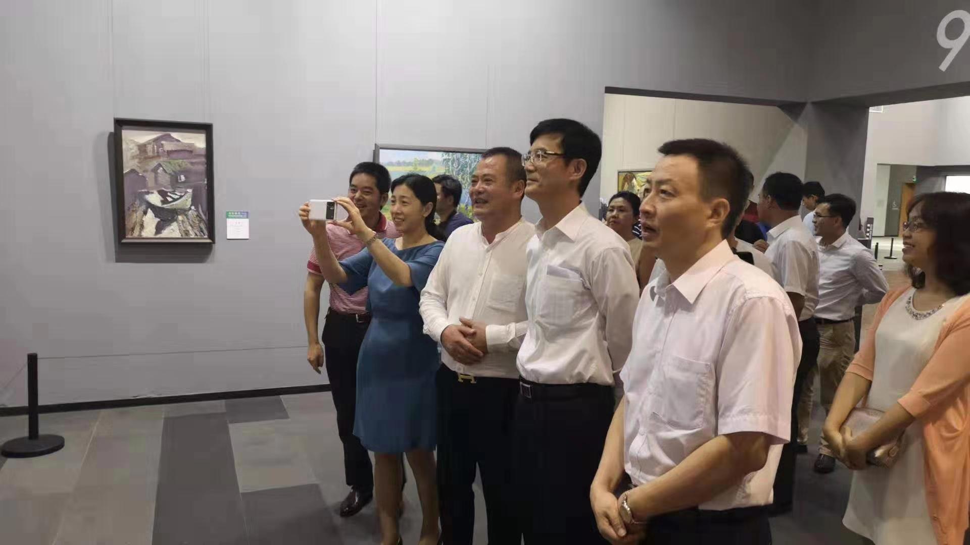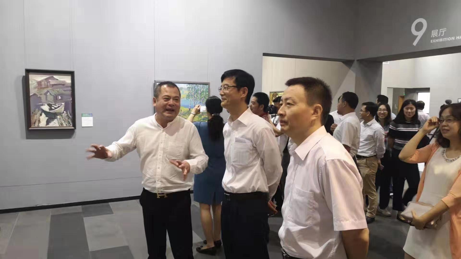 哈爾濱市松北區副區長張太功(中),深圳龍崗區委常委、宣傳部長鬍庚祥(右)在俄羅斯藝術展覽館館長劉明秀(左)的陪同下參觀展覽