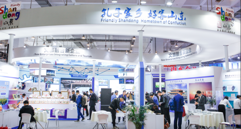 省文化和旅遊廳在展洽會上負責設計搭建「孔子家鄉·好客山東」展區。「孔子家鄉·好客山東」展區總體設計突出「文旅融合新動能」主題,展區整體呈現對稱的環形融合結構,象徵「文旅融合推動新舊動能轉換」;展區主色調為藍白相間的藍色海洋和深邃宇宙的生態色調,象徵「好客山東·擁抱世界」的國際情懷和胸懷,整體視覺富於中華文化神韻、當代前沿特色和全球化發展趨勢,表達了生生不息的文旅融合新動能、新形象、新未來。