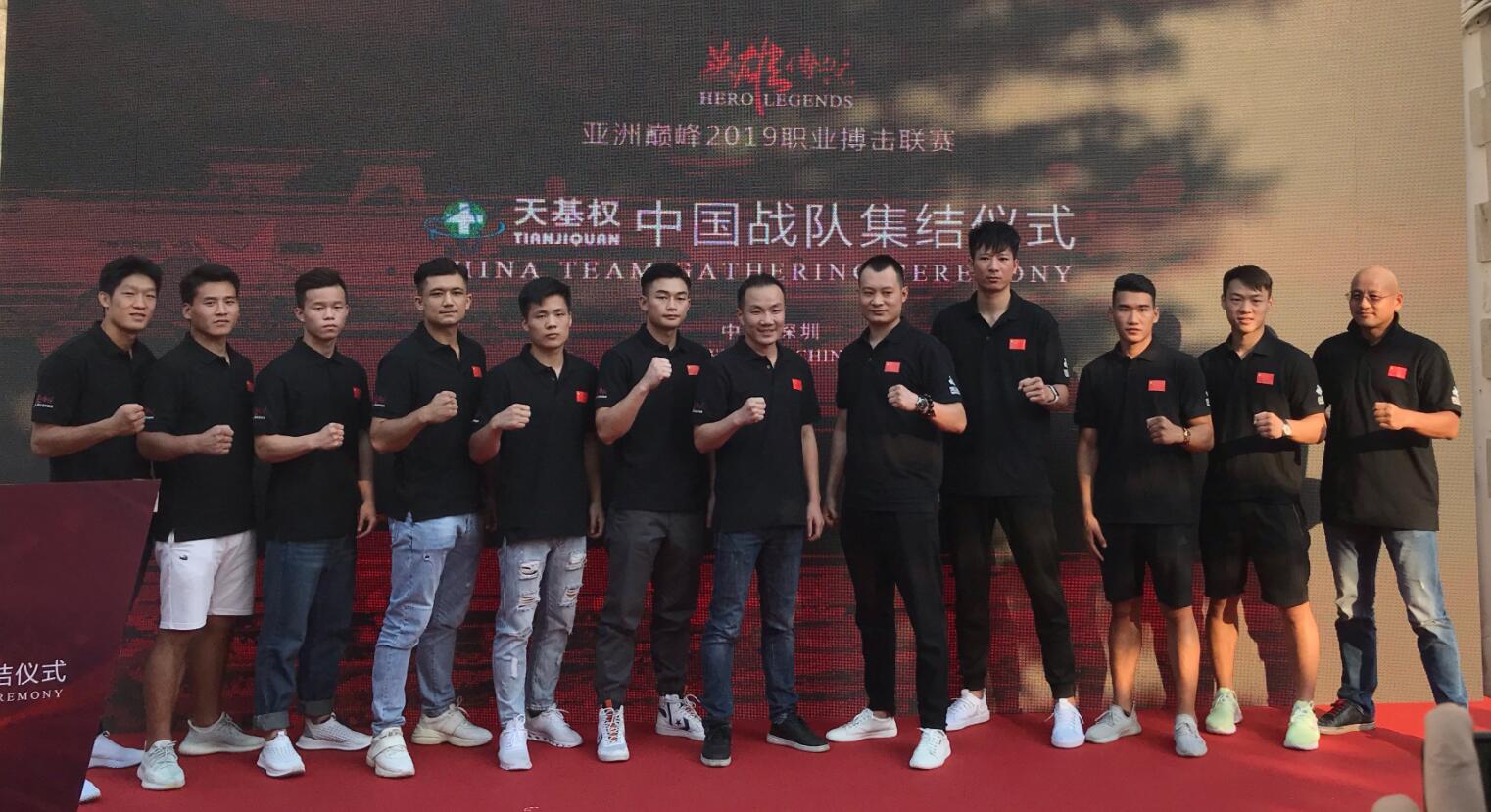 中國國際文化傳播中心深圳文創院院長、大賽組委會副主席、天基權集團董事長兼總裁釋延豹,「英雄傳說」賽事委員會執行主席鄒國俊,中國戰隊總教練、傳奇拳王「旋風」康恩共同出席集結儀式。代表大灣區百強俱樂部出戰的12位深圳本土精英拳手也整齊亮相,為即將打響的聯賽拉開大幕。