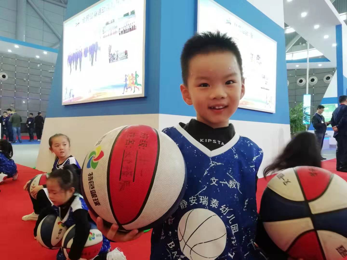 合肥文博會展覽館內的幼兒園小朋友籃球秀。園長王義紅介紹說,該幼兒園是文一教育集團旗下集團旗下12所幼兒園的「籃球擅長園」(孫軍/攝)